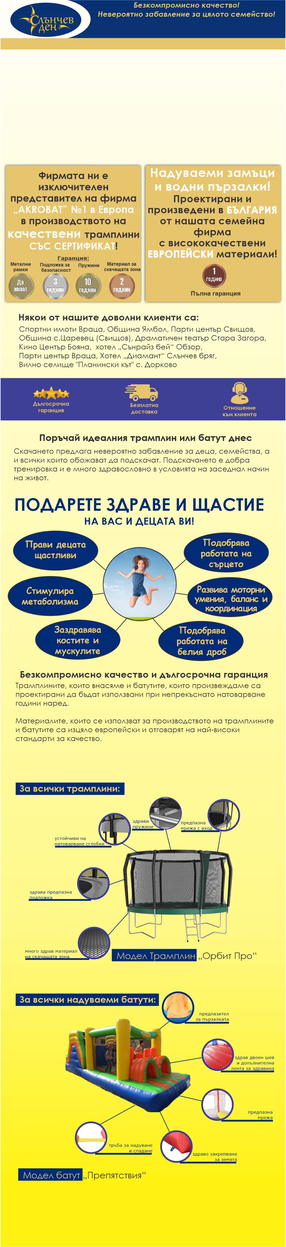Всички детски надуваеми замъци се продават комплект със помпа. Пройзвеждаме още: детски надуваем игрален център, надуваема водна пързалка, надуваеми батути, атракцион, покривала за басейни, детски център, външни и вътрешни детски кътове и центрове, плейграунд, оборудване за детски градини, пързалки, комбинирани обучителни надуваеми съоражения, надуваеми спортни игри, покривала за атв, мотори, тенис маси, шейни, външни мебели, земеделска техника и други всички изделия са сертифицирани и пройзведени с UV негорими и нетоксични материали подходящи за деца.детски надуваеми замъци , надуваеми батути, детски надуваеми замъци, детски надуваеми батути, батути с пързалки, замъци с пързалки, производство детски надуваеми замъци, производство детски надуваеми батути, детски надуваеми замъци под наем, детски надуваеми батути под наем, детски надуваеми замъци с пързалка под наем, детски надуваеми батути с пързалка под наем, надуваеми съоръжения и рекламни фигури, детски надуваеми замъци, помпа, детски надуваеми батути помпа, детски надуваем игрален център, надуваема водна пързалка, надуваеми батути с пързалка, надуваеми замъци с пързалка, детски атракцион, покривала за басейн, детски парти център, външни и вътрешни детски кътове, плейграунд, оборудване за детски градини, пързалки, комбинирани обучителни надуваеми съоръжения, надуваеми спортни игри, покривала за атв, мотори, тенис маси, шейни, външни мебели, земеделска техника, сертифицирани батути, сертифицирани замъци, комбинирани надуваеми съоръжения, надуваеми спортни игри, батути цена, батут цена, замък цена, трамплин, трамплини, професионални трамплини, трамплини за напреднали, детски трампли, детски трамплини,трамплин цена, трамплини цена, детски трамплин, фитнес трамплин,трамплин декатлон,трамплин за басейн, гимнастически трамплин,трамплин емаг,трамплини и батути, аксесоари за батути,сгъваеми трамплини, батути комплекти, трамплин домашен фитнес, фитнес батут, домашен трамплин, батути и трамплини за двора, трамплини за скачане, батути за скачане, трамплин за възрастни, детски трамплин с дръжка, family trampolines, family trampoline, professional grade trampolines, professional grade trampoline, acrobat trampolines, acrobat trampoline, trampoline parks, best quality trampolines, fun for kids, trampolines for experienced jumpers, orbit flat trampolines, orbit trampolines, top quality acrobat trampolines, acrobat dealer Bulgaria, hexia trampoline parks dealer, trampoline park modules, leading European manufacturers of trampolines, acrobat trampolines spare parts, ninja elements, winter party ideas, winter birthday party, indoor bouncers, indoor bouncy houses for rent, indoor funny birthday parties,what to do winter birthday parties, small bouncy houses, indoor birthday parties, indoor birthday party ideas, bouncy house rental,bouncy castle rentals,bounce house rental, bouncy castle rental, bouncy house, bouncy castle,bounce house for sale, sofia, vratsa, plovdiv, varna, burgas, romania, serbia, turkey, greece, macedonia, albania, indoor outdoor bouncy house,plastic balls rental, plastic balls rentals,theme panels for rent, wedding bouncer, wedding ball pit, wedding planning, wedding decoration, wedding fun ideas, family trampolines, family trampoline, professional grade trampolines, professional grade trampoline, acrobat trampolines, acrobat trampoline,trampoline parks, best quality trampolines,fun for kids,trampolines for experienced jumpers, orbit flat trampolines, orbit trampolines, top quality acrobat trampolines, acrobat dealer Bulgaria,hexia trampoline parks dealer, trampoline park modules, leading European manufacturers of trampolines, acrobat trampolines spare parts, ninja elements, children's inflatable play center, inflatable water slide, inflatable trampolines, attraction, pool covers, children's center, outdoor and indoor playgrounds and centers, playground, equipment for kindergartens, slides, combined educational inflatable sports equipment