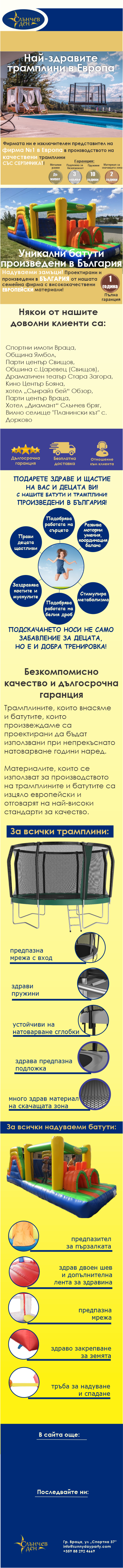 Всички детски надуваеми замъци се продават комплект със помпа. Пройзвеждаме още: детски надуваем игрален център, надуваема водна пързалка, надуваеми батути, атракцион, покривала за басейни, детски център, външни и вътрешни детски кътове и центрове, плейграунд, оборудване за детски градини, пързалки, комбинирани обучителни надуваеми съоражения, надуваеми спортни игри, покривала за атв, мотори, тенис маси, шейни, външни мебели, земеделска техника и други всички изделия са сертифицирани и пройзведени с UV негорими и нетоксични материали подходящи за деца.детски надуваеми замъци , надуваеми батути, детски надуваеми замъци, детски надуваеми батути, батути с пързалки, замъци с пързалки, производство детски надуваеми замъци, производство детски надуваеми батути, детски надуваеми замъци под наем, детски надуваеми батути под наем, детски надуваеми замъци с пързалка под наем, детски надуваеми батути с пързалка под наем, надуваеми съоръжения и рекламни фигури, детски надуваеми замъци, помпа, детски надуваеми батути помпа, детски надуваем игрален център, надуваема водна пързалка, надуваеми батути с пързалка, надуваеми замъци с пързалка, детски атракцион, покривала за басейн, детски парти център, външни и вътрешни детски кътове, плейграунд, оборудване за детски градини, пързалки, комбинирани обучителни надуваеми съоръжения, надуваеми спортни игри, покривала за атв, мотори, тенис маси, шейни, външни мебели, земеделска техника, сертифицирани батути, сертифицирани замъци, комбинирани надуваеми съоръжения, надуваеми спортни игри, батути цена, батут цена, замък цена, трамплин, трамплини, професионални трамплини, трамплини за напреднали, детски трампли, детски трамплини,трамплин цена, трамплини цена, детски трамплин, фитнес трамплин,трамплин декатлон,трамплин за басейн, гимнастически трамплин,трамплин емаг,трамплини и батути, аксесоари за батути,сгъваеми трамплини, батути комплекти, трамплин домашен фитнес, фитнес батут, домашен трамплин, батути и трамплини за двора, трамплини за скачане, батути за скачане, трамплин за възрастни, детски трамплин с дръжка, family trampolines, family trampoline, professional grade trampolines, professional grade trampoline, acrobat trampolines, acrobat trampoline, trampoline parks, best quality trampolines, fun for kids, trampolines for experienced jumpers, orbit flat trampolines, orbit trampolines, top quality acrobat trampolines, acrobat dealer Bulgaria, hexia trampoline parks dealer, trampoline park modules, leading European manufacturers of trampolines, acrobat trampolines spare parts, ninja elements, winter party ideas, winter birthday party, indoor bouncers, indoor bouncy houses for rent, indoor funny birthday parties,what to do winter birthday parties, small bouncy houses, indoor birthday parties, indoor birthday party ideas, bouncy house rental,bouncy castle rentals,bounce house rental, bouncy castle rental, bouncy house, bouncy castle,bounce house for sale, sofia, vratsa, plovdiv, varna, burgas, romania, serbia, turkey, greece, macedonia, albania, indoor outdoor bouncy house,plastic balls rental, plastic balls rentals,theme panels for rent, wedding bouncer, wedding ball pit, wedding planning, wedding decoration, wedding fun ideas, family trampolines, family trampoline, professional grade trampolines, professional grade trampoline, acrobat trampolines, acrobat trampoline,trampoline parks, best quality trampolines,fun for kids,trampolines for experienced jumpers, orbit flat trampolines, orbit trampolines, top quality acrobat trampolines, acrobat dealer Bulgaria,hexia trampoline parks dealer, trampoline park modules, leading European manufacturers of trampolines, acrobat trampolines spare parts, ninja elements, children's inflatable play center, inflatable water slide, inflatable trampolines, attraction, pool covers, children's center, outdoor and indoor playgrounds and centers, playground, equipment for kindergartens, slides, combined educational inflatable sports equipment